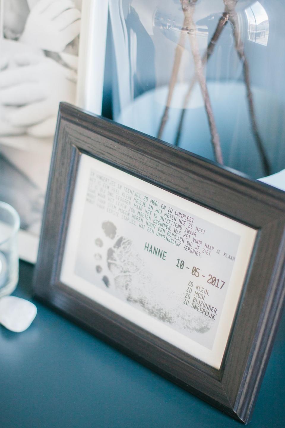 "Zelf hebben wij een berichtje op Facebook geplaatst om de geboorte en het overlijden van onze dochter aan te kondigen. Hierin verwerkte ik een voetafdrukje van onze dochter, een stukje tekst wat eigenlijk in haar geboortekaartje had moeten staan en een gedichtje uit het boekje wat het ziekenhuis ons mee naar huis gaf."